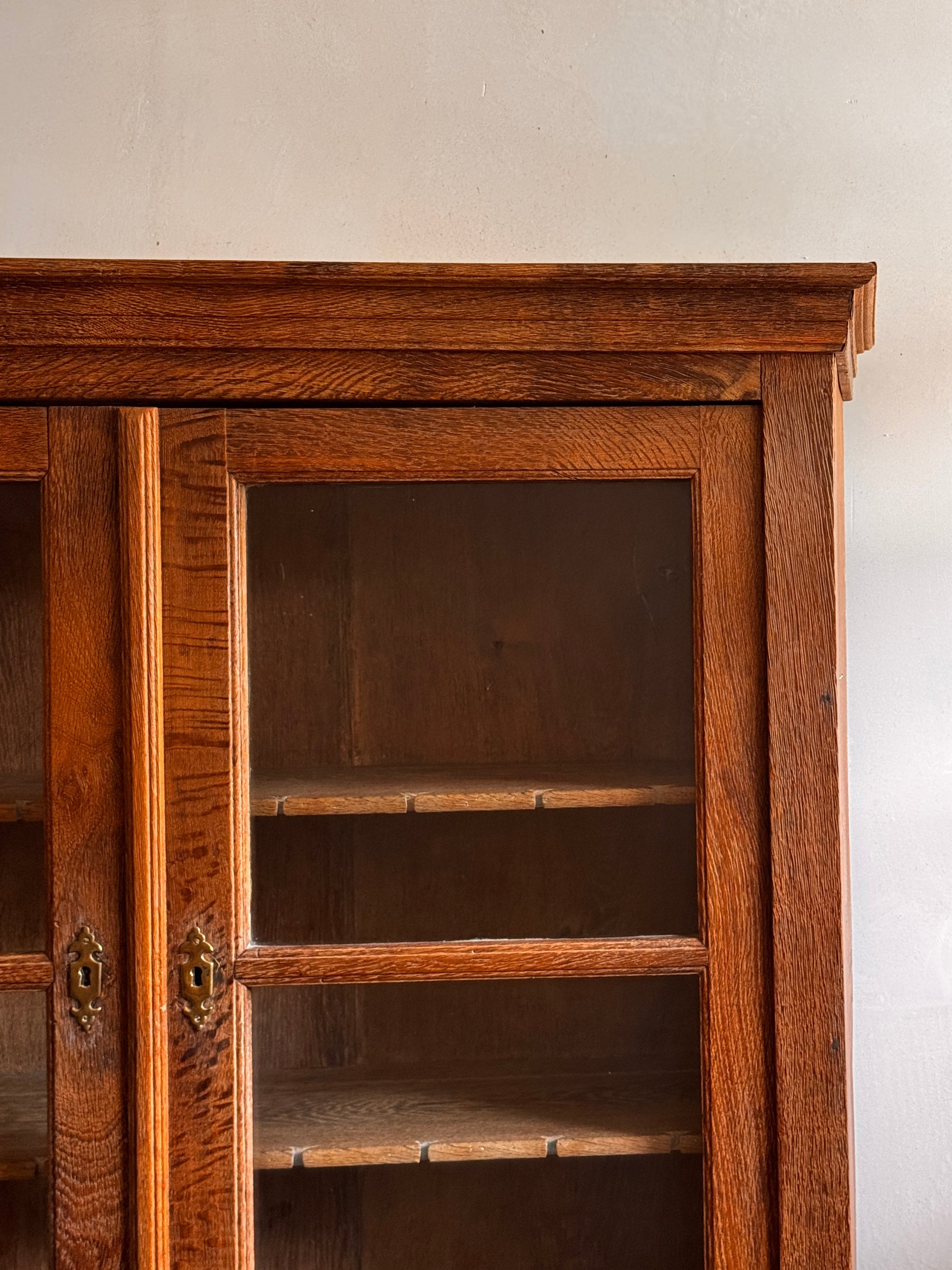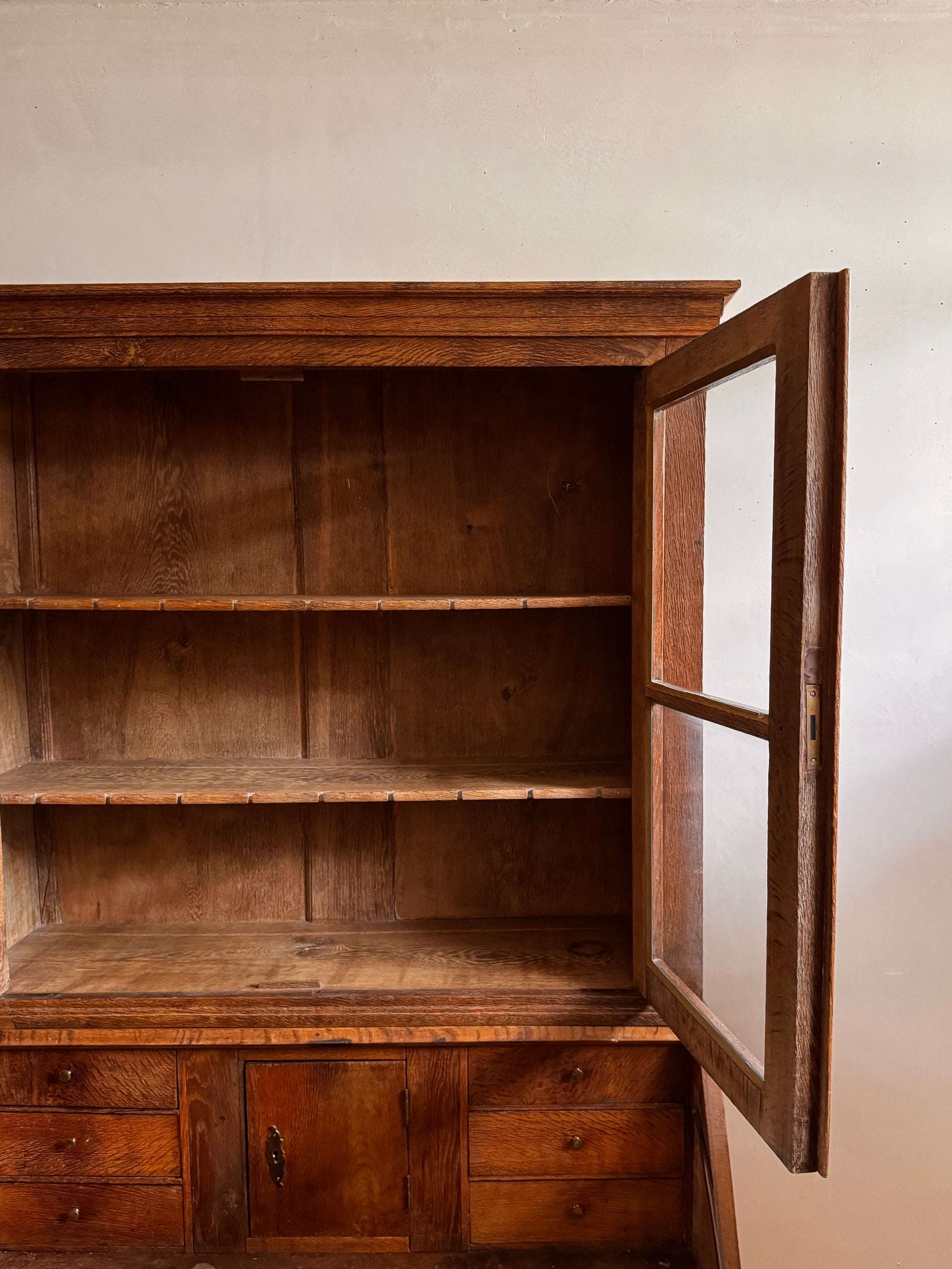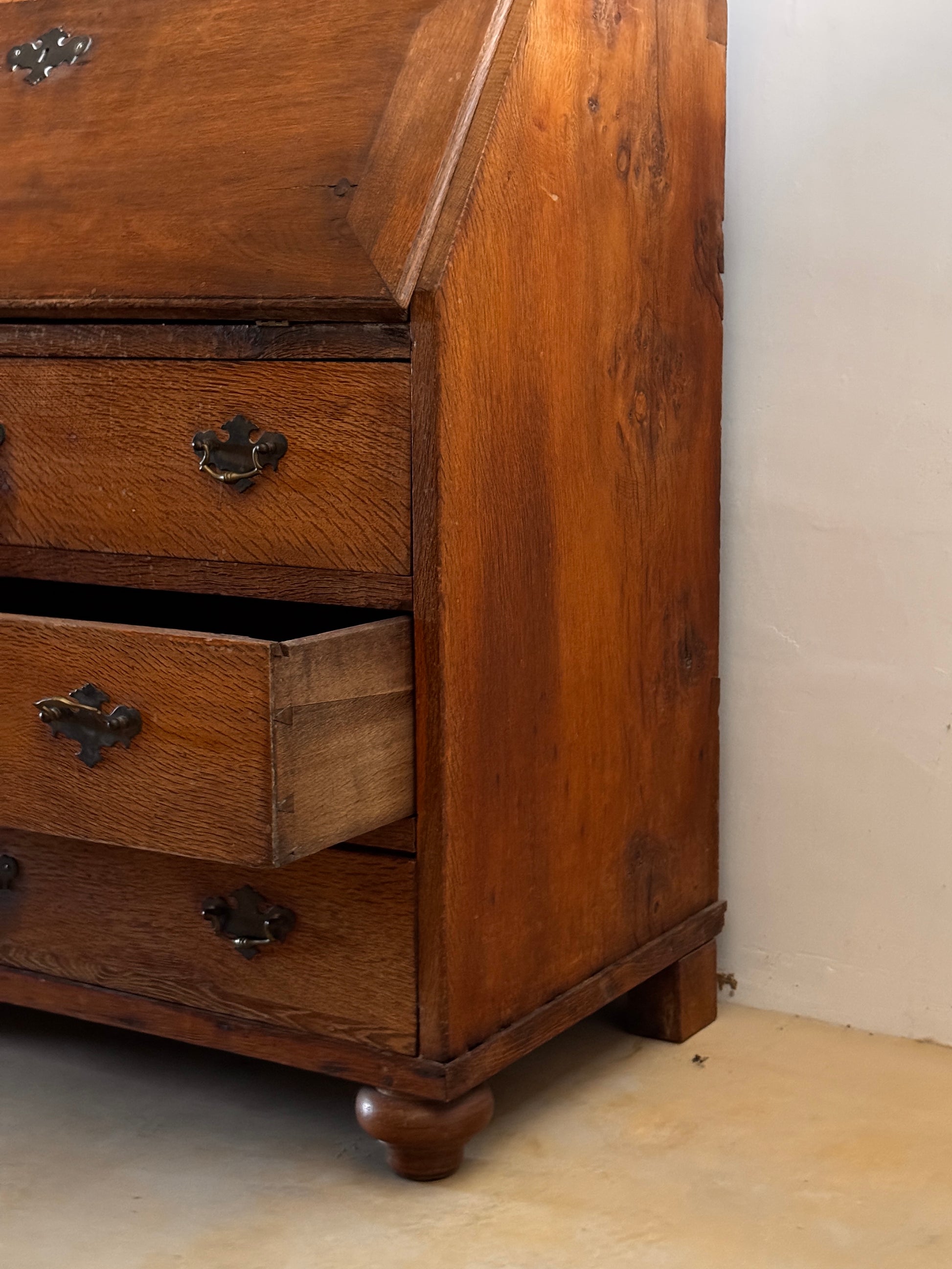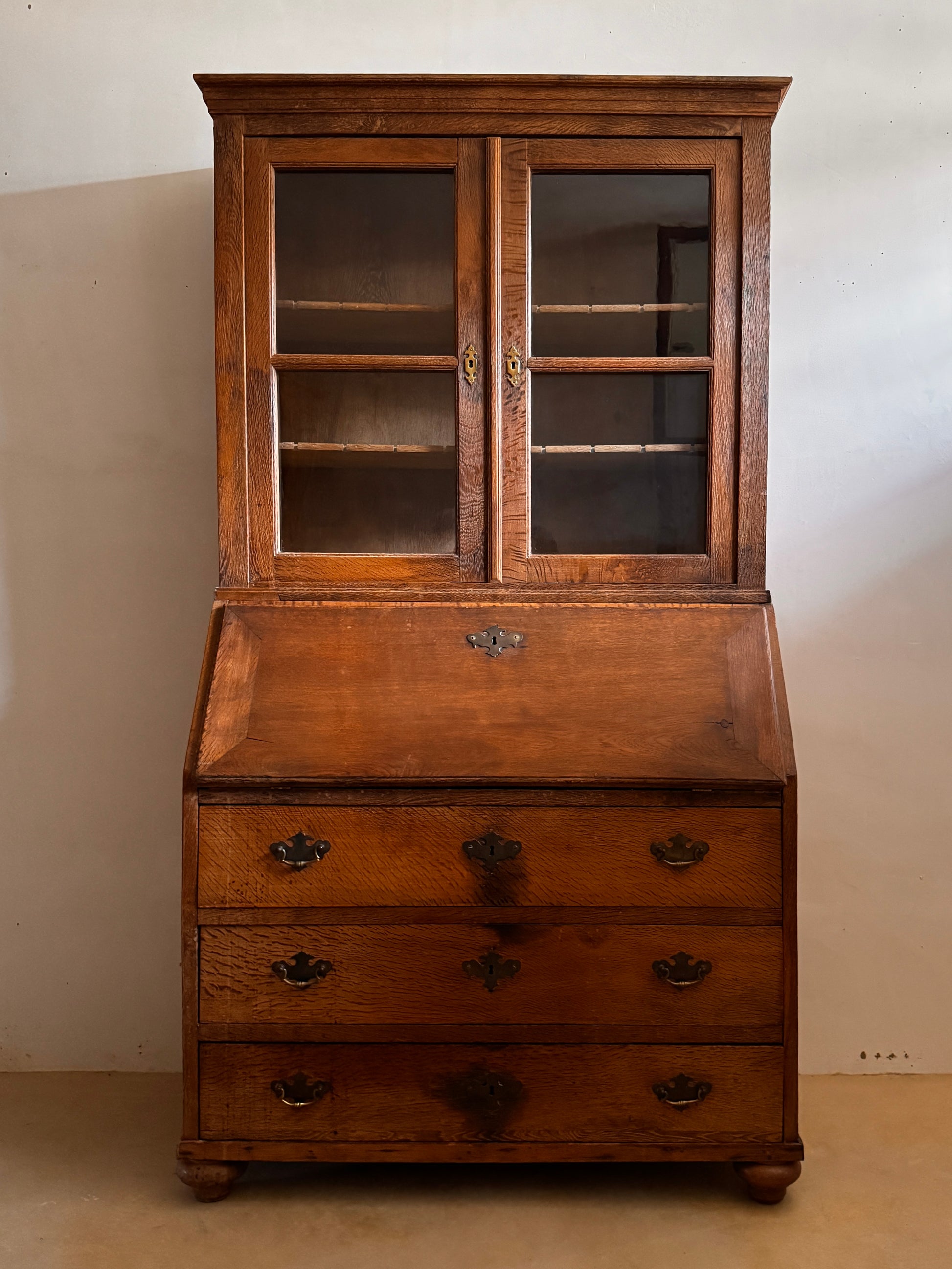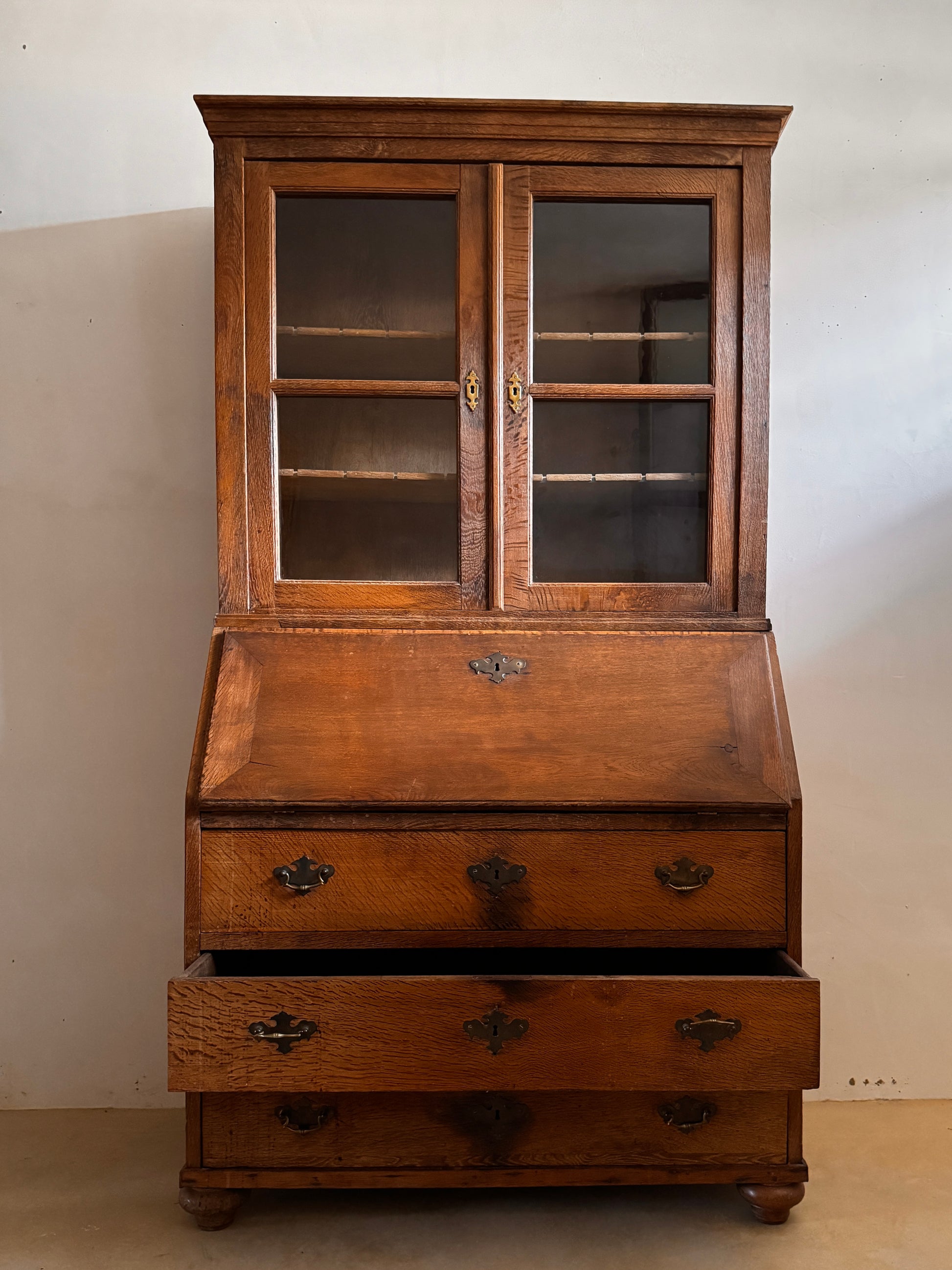 Elegant piece of furniture from Northern Germany, crafted from fine solid wood, where the warmth of its natural grain and delicate finish enhance any setting. Its glass-enclosed upper cabinet beautifully protects and displays books or treasured objects, while the fold-down desk invites moments of writing and contemplation. The three lower drawers, adorned with ornamental hardware, offer generous storage space, combining functionality and timeless beauty.