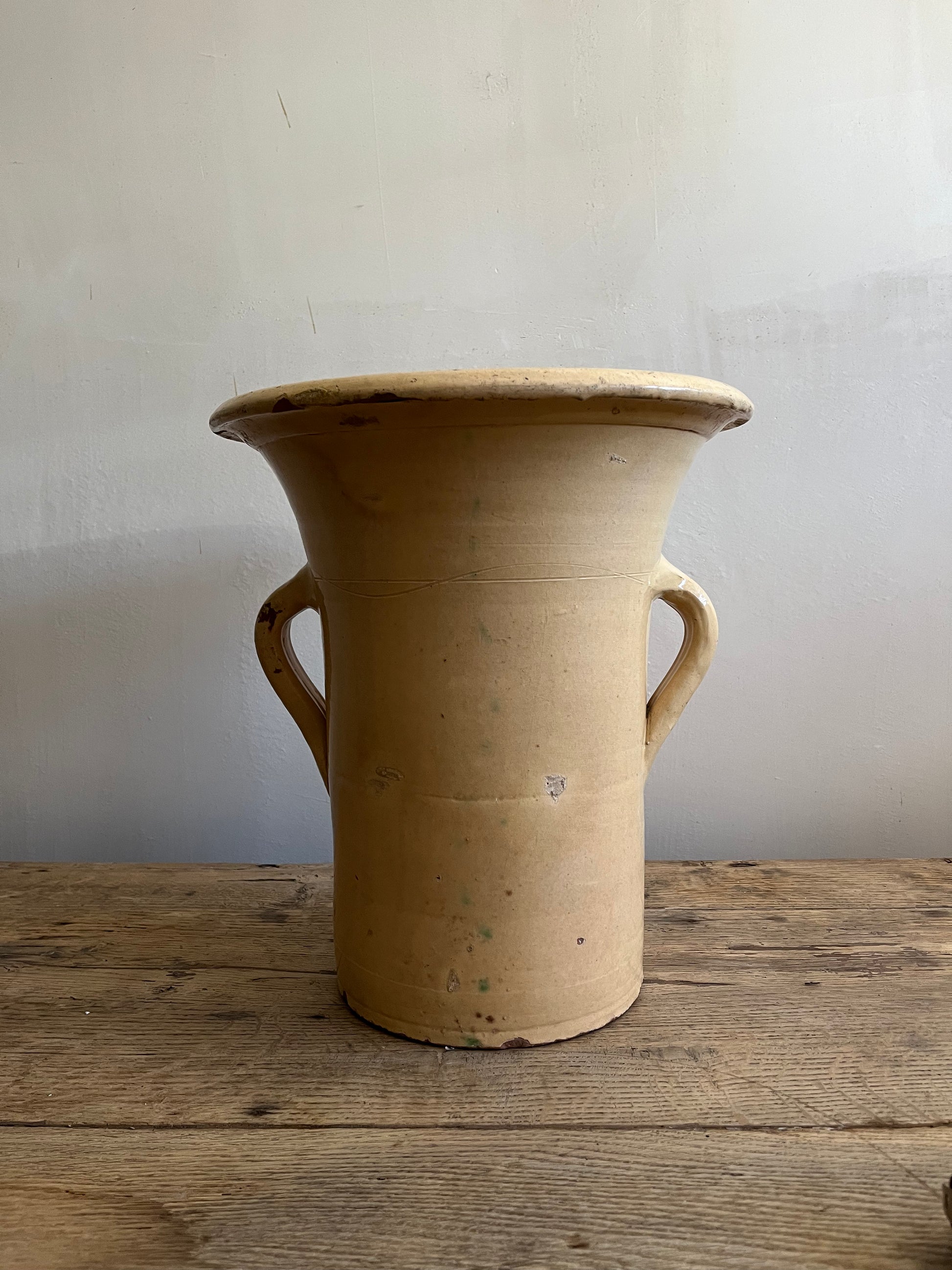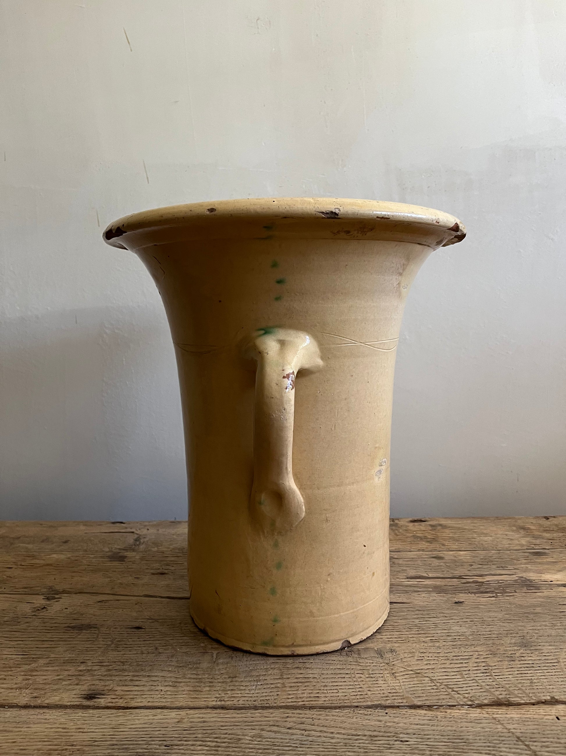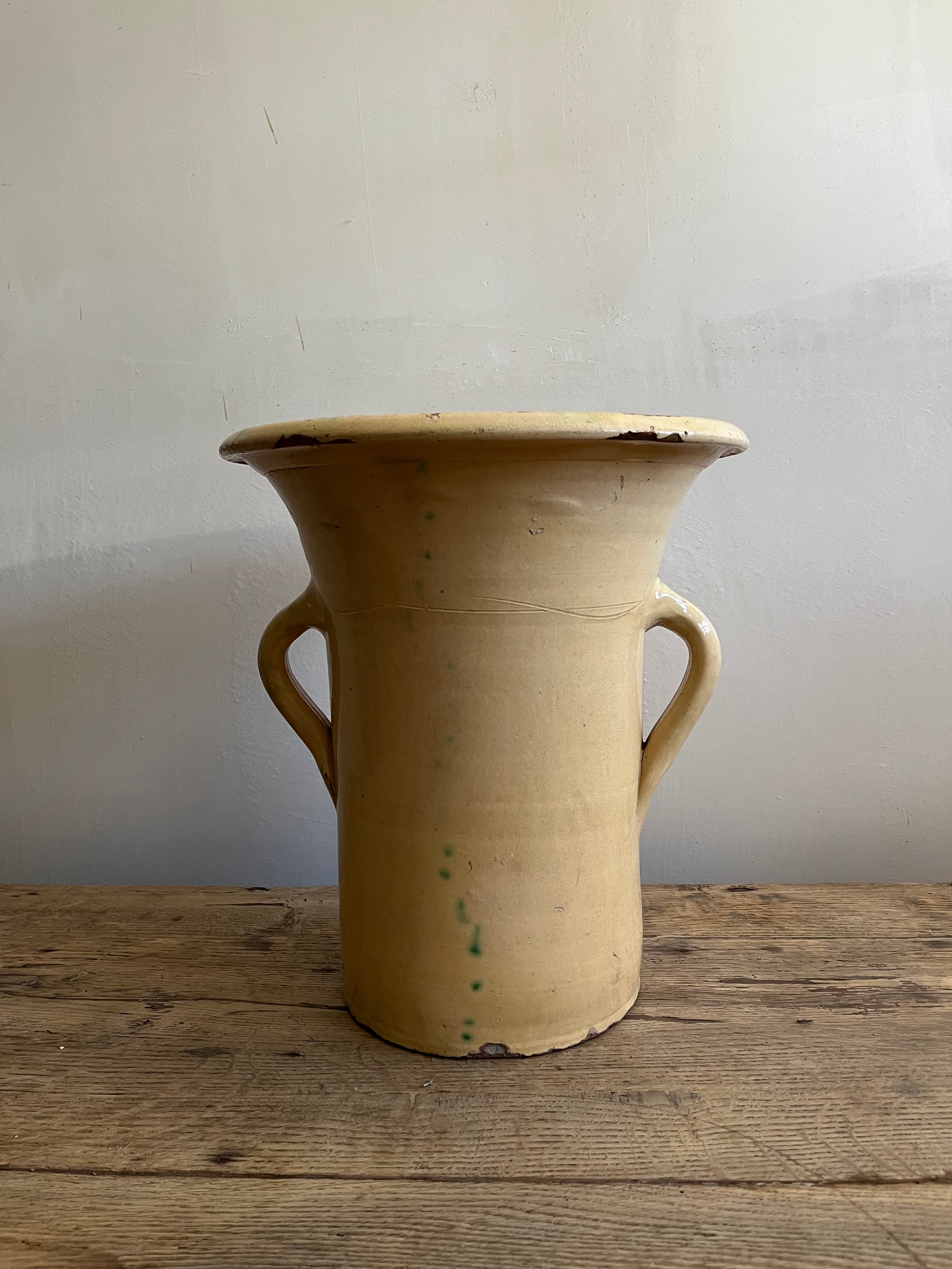 Exceptional and colorful glazed earthenware from the early 19th century, handmade in Catalonia. Featuring a wide rim, tapered base, and D-shaped handles.
