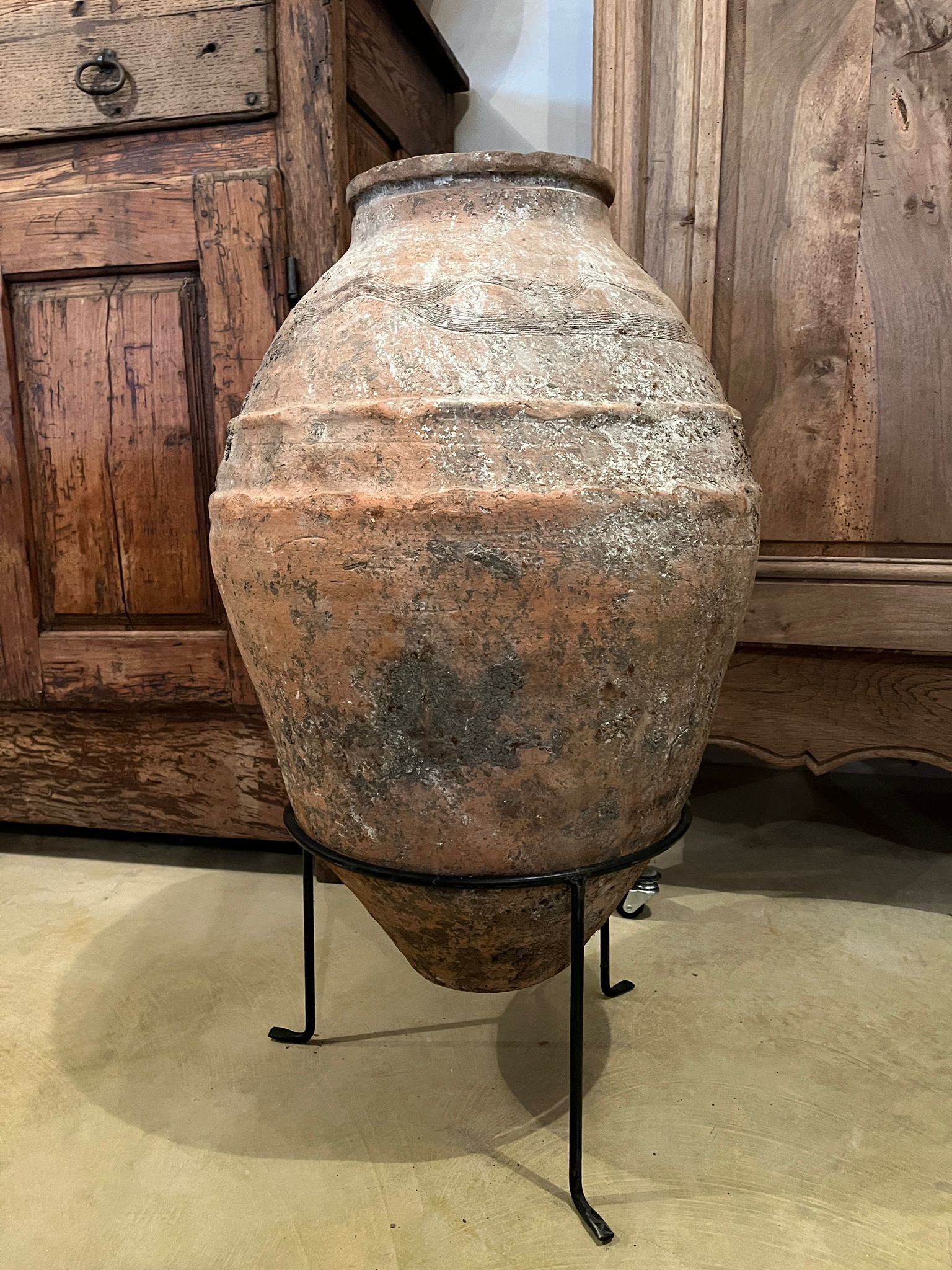 Tinaja de terracota de Anatolia, posiblemente del siglo XVIII o XIX. Superficie erosionada por el tiempo. Los depósitos minerales sugieren exposición prolongada al aire libre o junto al mar.